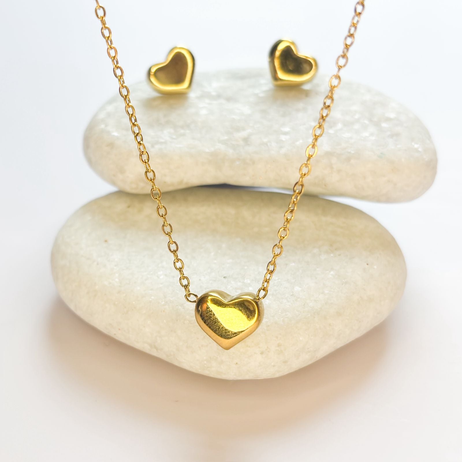 Crafted in anti-tarnish stainless steel with premium PVD gold plating, this set is waterproof, sweat-proof, and built to last. Featuring a heart-shaped pendant on a sleek chain, paired with matching heart-shaped earrings, it radiates playful elegance and feminine charm.